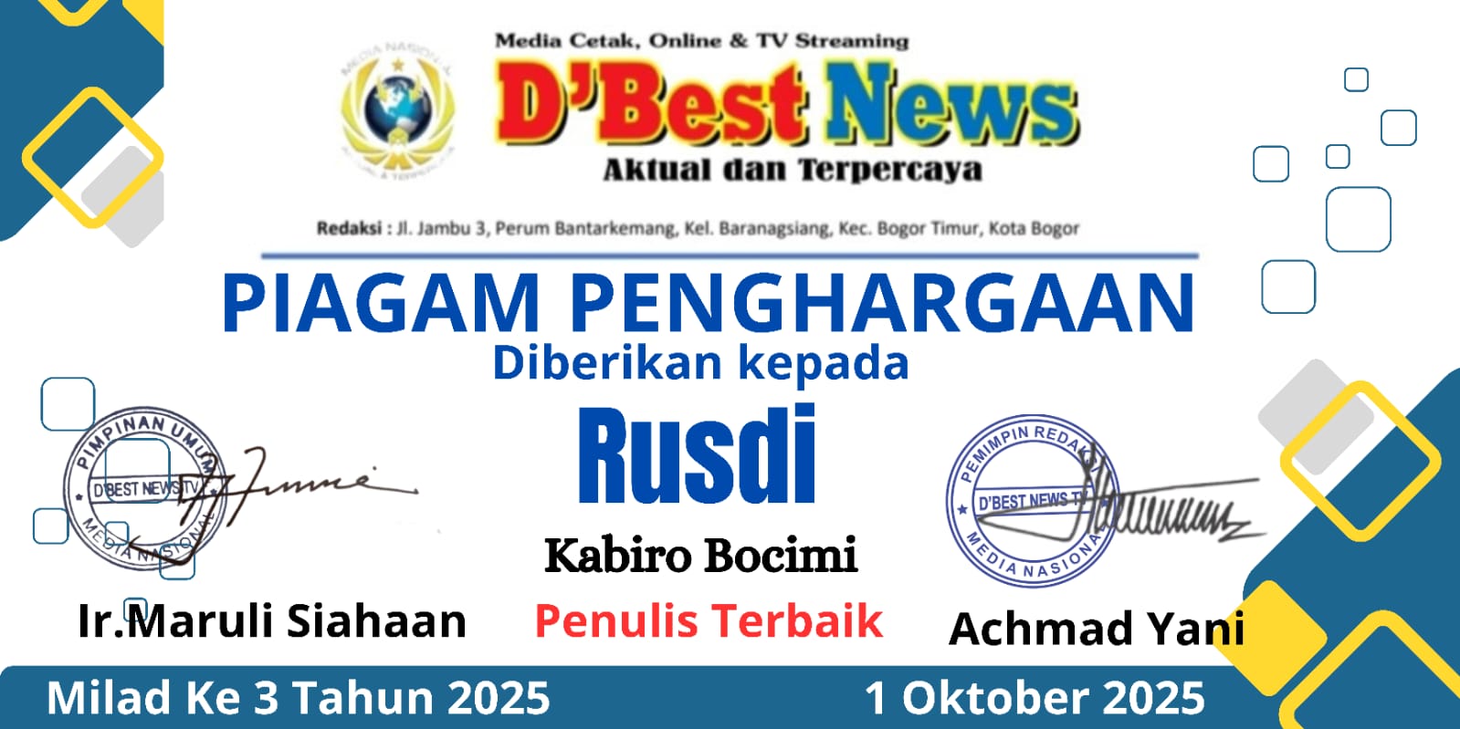 Metrojabaronline.com // Bogor, – Rasa syukur mengiringi perayaan HUT ke-3 Media DBestnews yang digelar pada Rabu (1/10/2025) di Kantor Redaksi DBestnews, Jl. Jambu 3 No.15, Perumahan Bantarkemang, Kota Bogor. Dalam momentum istimewa ini, Rusdi, Kepala Biro Bogor, Cianjur, dan Sukabumi (Bocimi), kembali berhasil mempertahankan piagam penghargaan yang juga ia raih pada perayaan HUT DBestnews ke-2 tahun lalu.