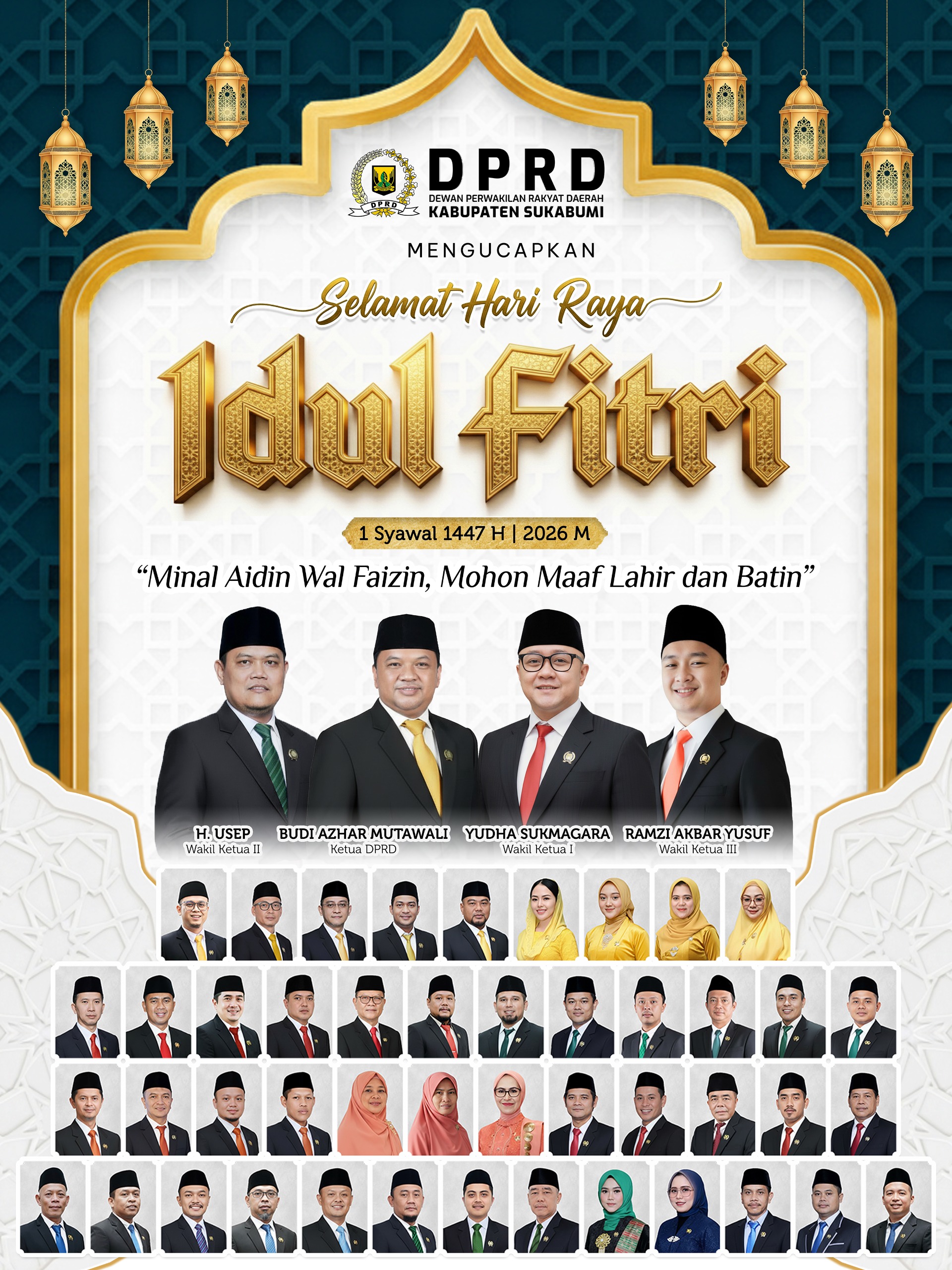 “Minal Aidzin Wal Faidzin, Mohon Maaf Lahir dan Batin. Selamat Hari Raya Idul Fitri 1447 H. Semoga kebahagiaan, kedamaian, dan keberkahan senantiasa menyertai kita semua,” demikian disampaikan dalam ucapan Pimpinan dan Anggota DPRD Kabupaten Sukabumi.