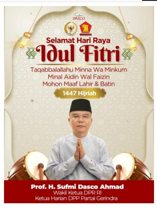 Metrojabaronline.com // Jakarta,– Wakil Ketua DPR RI Sufmi Dasco Ahmad, mewakili segenap pimpinan Dewan Perwakilan Rakyat Republik Indonesia (DPR RI), menyampaikan pesan mendalam dalam rangka menyambut Hari Raya Idul Fitri 1 Syawal 1447 Hijriah. Beliau mengajak seluruh lapisan masyarakat, khususnya umat Muslim, untuk menjadikan momentum kemenangan ini sebagai sarana mempererat tali silaturahmi dan memperkuat persatuan bangsa.